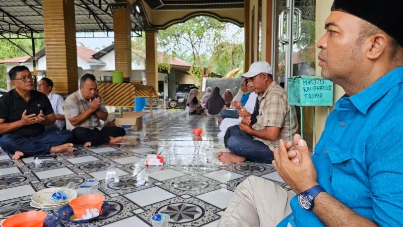 Foto : Camat Gebang Sofyan Tarigan, S.Sos,MAP saat bersilaturahmi dengan warga dusun II Dogang di Masjid Raudathul Tauhid.(wis)