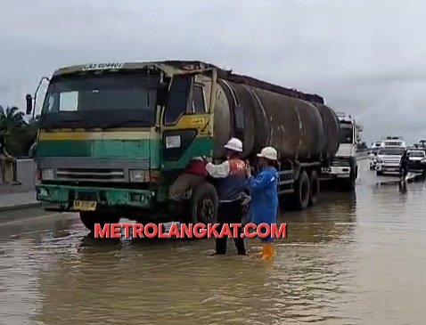 Hujan deras yang mengguyur wilayah Langkat sejak Kamis malam menyebabkan Jalan Tol Kuala Bingai–Stabat lumpuh total.